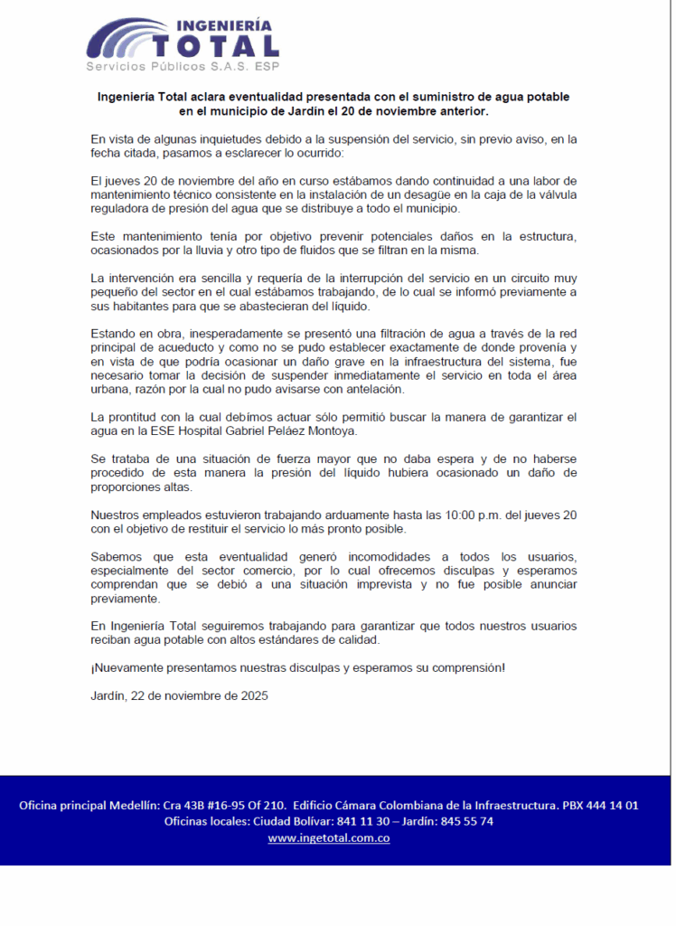 Ingeniería Total Servicios Públicos explica a sus usuarios del municipio de Jardín las razones por las cuales se presentó suspensión del servicio el pasado 20 de noviembre.